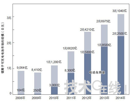 5年內(nèi)成長90倍——鋰離子充電電池市場正處于大轉型期。在被電動車(EV)采用后,預期鋰離子充電電池市場在未來5年內(nèi)將超越3萬億日元。技術發(fā)展的激烈競爭已展開,一系列新加入公司使得情況更為熱鬧。
