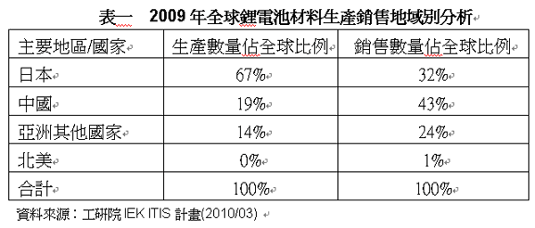 在生產(chǎn)與銷(xiāo)售地區(qū)上,在2009年仍然呈現(xiàn)集中于亞洲的態(tài)勢(shì),其中日本仍為最主要的正極材料生產(chǎn)與銷(xiāo)售大國(guó),雖然在日本國(guó)內(nèi)因生產(chǎn)成本高漲之故,鋰電池的制造出口逐年下降中,但至今全球仍有近67%的鋰電池正極材料在日本生產(chǎn),中國(guó)與其他亞洲地區(qū)僅占19%與14%。至于在銷(xiāo)售地區(qū)分布上,由于下游的電池大廠(chǎng)仍以日商為多,因此日本仍為銷(xiāo)售地區(qū)比例最高的國(guó)家,其他依序?yàn)橹袊?guó)、其他亞洲地區(qū)、北美等地。