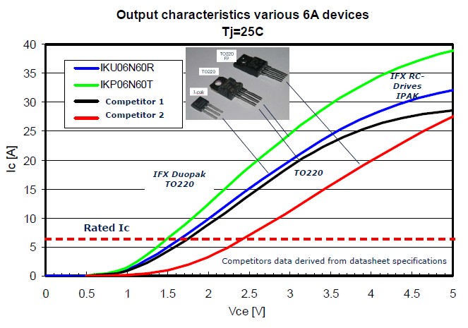 總結(jié)一下IGBT的重要特點(diǎn),一個是成本,因?yàn)樗捎玫氖且粋€晶圓,所以它的成本有很大的優(yōu)勢;另外因?yàn)闇p少了它的封裝,可以給PCB留下更多的空間,進(jìn)一步提高產(chǎn)品的功率密度。同時它也有一個非常好的性能,非常低的飽和導(dǎo)通壓降,一個非常軟的開關(guān)特性對EMI非常有幫助,它還有一個很好的溫度特性,最高溫度可以達(dá)到175度。藍(lán)色曲線是逆向?qū)ㄐ虸GBT和目前TO220封裝的飽和導(dǎo)通壓降的比較。這是用一個6安的產(chǎn)品在做比較,當(dāng)這個電流在6安的時候可以看到飽和導(dǎo)通壓降非常的低。
