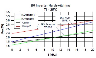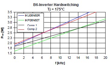 這個是25度損耗的時候,這個是175度損耗的時候,可以看到藍(lán)色的這根線,基本上它的損耗跟這個TO220封裝產(chǎn)品相差并不是很大。這個是在基于剛才基礎(chǔ)上做的一個損耗分析,首先頻率在4K赫茲的時候可以看到,這個淺藍(lán)色的就是二極管的開關(guān)損耗,這個是二極管的導(dǎo)通損耗,這個是IGBT的開關(guān)損耗,這個是IGBT的導(dǎo)通損耗??梢钥吹皆?K的情況下導(dǎo)通損耗這一部分和這一部分是占了絕對支配地位的。所以對于一個低頻應(yīng)用來說減少它的飽和導(dǎo)通壓降對于IGBT是相當(dāng)?shù)闹匾?,?dāng)它的頻率升高的時候,它的開關(guān)損耗就會稍微升高一點(diǎn)。