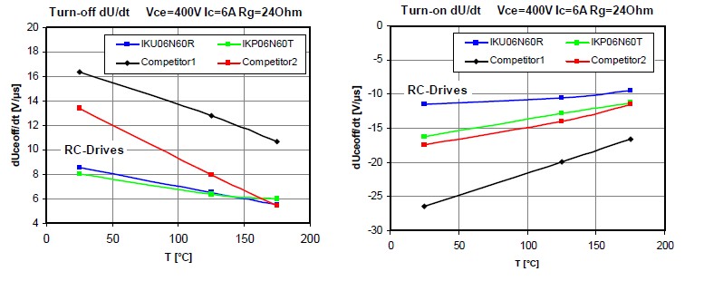 再加上不同的驅(qū)動電阻,這個時候我們也對dV/dt進(jìn)行了一個測試,然后可以看到基本上我們的dV/dt都比我們的競爭對手或者市面上的產(chǎn)品會優(yōu)異很多。因?yàn)闇p少IGBT的dV/dt的話可以減少前級的EMI濾波器的要求,同樣也可以減少成本,所以這個產(chǎn)品不僅在本身的價格上面有優(yōu)勢,同樣也可以整體的減少系統(tǒng)的成本。