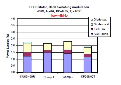衡量一個IGBT的好壞有兩個非常重要的指標(biāo),一個就是它的飽和導(dǎo)通壓降,就是Vce(sat),另外一個就是開關(guān)損耗,也就是Eoff。對于低頻的應(yīng)用來說,飽和導(dǎo)通壓降是占有絕對支配地位的,所以選擇這種RC-Drives的IGBT會是一個非常好的選擇,因?yàn)榭梢钥吹竭@種RC-Drives IGBT的飽和導(dǎo)通壓降是遠(yuǎn)遠(yuǎn)低于市面上的一些產(chǎn)品。這個是在一個無刷電機(jī)上面的損耗的分析。