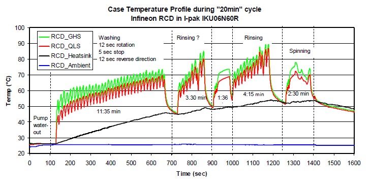 下面就是為了驗(yàn)證這種逆向?qū)ㄐ虸GBT在實(shí)際應(yīng)用當(dāng)中的一個表現(xiàn),我們在一個洗衣機(jī)上面驗(yàn)證了6安的IPARK的產(chǎn)品,在一個風(fēng)機(jī)上面我們驗(yàn)證了6安的DPARK的產(chǎn)品。這是一個實(shí)際的洗衣機(jī)的控制板,這種方式就是采用了夾子,然后把這個IGBT夾在散熱器上面。稍候我們會用這種IPARK的封裝對這種TO220的封裝做一些替代,然后比較一下他們的不同。就是說我們把其中的一路替代成IPARK產(chǎn)品,然后做一個效率還有溫度的檢測,通過這種熱電偶的方式來檢測它的表面溫度,來檢測它的結(jié)溫。因?yàn)樗饷嬗幸粋€夾子,我們沒有辦法用紅外相機(jī)來檢測它的溫度,所以我們采用了這種熱電偶的方式。這個是洗衣機(jī)的工作流程,首先的話是抽水,這個是洗滌,這個是漂洗,這個是甩干,整個20分鐘的流程當(dāng)中它的溫度的表現(xiàn),基本上它的最高溫度沒有超過90度,我們可以看到這個綠色和紅色有一點(diǎn)稍微小小的區(qū)別,這是因?yàn)樗纳岵灰粯樱琁GBT的位置放在不一樣,所以會有一點(diǎn)不一樣,這個不用太過擔(dān)心。