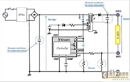創(chuàng)意電子新近推出的TK5401就是這樣一款LED驅(qū)動電源IC,它具有不需要DC電源特性中所必須的電解電容的特性,使得LED壽命高達4萬小時以上。據(jù)介紹,TK5401封裝內(nèi)置了高電壓功率MOS管及控制電路,因去除電解電容實現(xiàn)了小型化、低成本,并且實現(xiàn)了LED燈的長壽命和高效能。