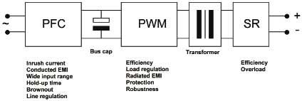 脈寬調(diào)制級(jí)(PWM)是主要的轉(zhuǎn)換器級(jí)。其中DC電壓被斬波為更高頻率的方波,因此利用更小的變壓器就可以轉(zhuǎn)換到另一個(gè)電壓級(jí)并提供隔離。并非所有的拓?fù)涠疾捎谜伎毡茸兓姆讲?,有些拓?fù)洳捎玫氖亲冾l,還有的則是改變兩個(gè)脈沖序列之間的相位。這一級(jí)主要確定轉(zhuǎn)換器的效率和負(fù)載調(diào)節(jié)。轉(zhuǎn)換器效率十分重要,首先它關(guān)系電源的運(yùn)行成本;其次是必須通過(guò)機(jī)箱冷卻來(lái)散除產(chǎn)生的熱量;第三是熱組件越大,就越昂貴,占用空間也越大。這三個(gè)因素與電源的使用壽命成本關(guān)系重大。