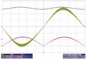 圖3中,綠色曲線的較厚區(qū)域代表電流紋波,PFCIC在峰值輸入電壓下消耗電流較多,過(guò)零時(shí)沒(méi)有電流。粉色曲線代表整流器輸入電壓,藍(lán)色曲線為輸出電壓。