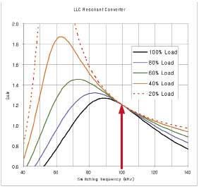利用PFC級(jí),LLC轉(zhuǎn)換器的輸入可設(shè)置在400V左右。如果所需輸出電壓為12V、匝數(shù)比為40:1,則額定負(fù)載下需要1.2的DC增益。無(wú)論負(fù)載情況如何,頻率始終不變。
