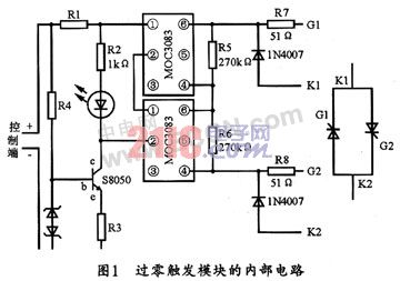 由于切除的電容器上一般都有剩余電壓,而電容器兩端的電壓不能突變,因此,當系統(tǒng)電壓和電容器殘壓的差值較大時,觸發(fā)晶閘管會產生很大的沖擊電流,而可能直接損壞晶閘管。為了實現(xiàn)動態(tài)無功補償裝置快速響應,同時又保證投切無沖擊電流,因此需要檢測電容器電壓和電網(wǎng)電壓。只有當兩者大小相等、極性相同時,才能瞬時投入電容。因此需要加裝過零觸發(fā)模塊。目前,從晶閘管兩端取得過零信號的典型觸發(fā)電路是MOC3083。MOC3083芯片內部有過零觸發(fā)判斷電路,它是為220V電網(wǎng)電壓設計的專門芯片,其芯片的雙向可控硅耐壓為800V。在4、6兩端電壓低于12V時,如果輸入觸發(fā)電流,其內部的雙向可控硅導通。圖1所示是用在380V電網(wǎng)的TSC電路上串聯(lián)兩只MOC3083的過零觸發(fā)模塊的內部電路圖。