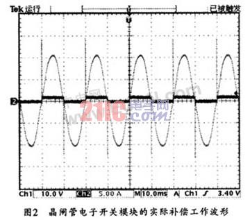 在無功補償實際應用中,可將晶閘管電子開關模塊用在TSC低壓無功補償以替代接觸器,這樣,就可以在開關電壓過零時投入補償電容量,從而避免了沖擊電流的產生和瞬間電網(wǎng)電壓的波動。圖2所示是其工作波形圖。
