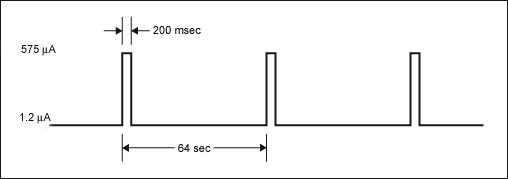周期性地測量溫度使得器件在短時間內(nèi)(最差情況下為200ms)的電流損耗增大。圖1給出了DS3231在最差情況下的電流損耗,計算中假設電池電壓為3.63V,I²C兼容接口不工作。