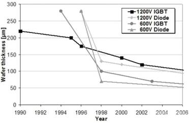 由于導(dǎo)通電壓和關(guān)斷損耗在很大程度上取決于晶圓的厚度,因此需要做更薄的IGBT。圖4顯示了英飛凌600/1,200VIGBT和EMCON二極管的晶圓厚度趨勢(shì)。對(duì)于新型1,200VRC-IGBT而言,120um厚度晶圓將是標(biāo)準(zhǔn)工藝。這需要進(jìn)行復(fù)雜的晶圓處理,包括用于正面和背面的特殊處理設(shè)備。將晶圓變薄可通過(guò)晶圓打磨和濕式化學(xué)蝕刻工藝實(shí)現(xiàn)。