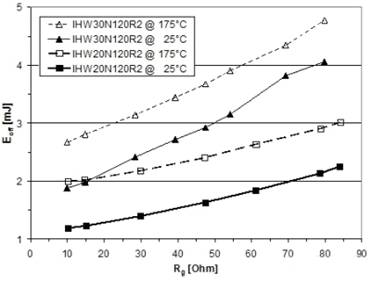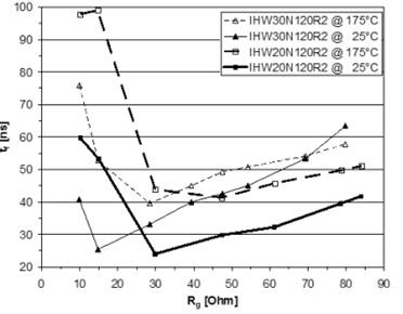 在典型飽和壓降Vce(sat)=1.6V@25℃/1.85V@175℃和典型正向電壓Vf=1.25V@175℃(額定電流)的條件下,功率損(特別是軟開關(guān)應(yīng)用的導(dǎo)通損耗)可大幅度降低。由IHW20N120R2的下降時(shí)間的切線可看出高速度—tf=24ns@25℃和Rg=30Ω(44ns@175℃)。IHW30120R2在下降時(shí)間方面是最為出色的:tf=33ns@25℃,Rg=30Ω;tf=40ns@175℃。(在硬開關(guān)條件下測(cè)量,參見帶有Eoff曲線的圖6和圖7)。