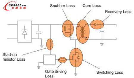 圖1給出反激式開關電源在待機狀態(tài)下的主要損耗類型,其中功率管開關損耗、驅(qū)動損耗、變壓器磁芯損耗、輸出整流管反向恢復損耗以及緩沖器損耗都屬于開關損耗。各種類型的開關損耗都與開關頻率有關,降低開關頻率可以減少開關損耗??刂齐娐返膿p耗主要表現(xiàn)為啟動電阻上的損耗,而啟動電阻的損耗直接與整流后的直流母線電壓和啟動電阻值。在保證寬電壓輸入的工作條件下可以通過降低啟動電流的方法來降低啟動電阻損耗。