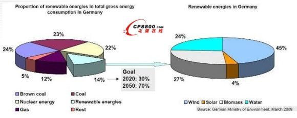 歐洲是現(xiàn)代能源和氣候政策的先驅(qū),德國是利用新能源技術(shù)方面一個最好的例證。鑒于到2020年,要實(shí)現(xiàn)減少14%的二氧化碳排放量(與2005年的排放量相比)的目標(biāo),到2020年可再生能源在初級能源消耗中的比例要增加到18%(2005年為6%)。對于德國總電力消費(fèi)來說,這意味著到2020年可再生能源的份額將增加一倍,如圖2所示。展望未來,到2050年計(jì)劃可再生能源的份額達(dá)到70%。