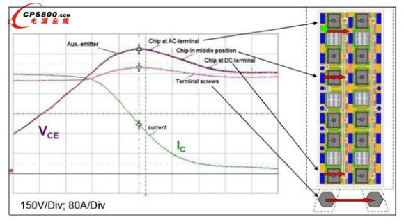 最后一點(diǎn)值得考慮的是新SKiM模塊的內(nèi)部機(jī)械設(shè)計(jì)。圖6顯示了標(biāo)有芯片位置的陶瓷襯底的布局。要注意布局的高度對稱性。在右側(cè)可以看到同時(shí)也扮演機(jī)械壓接系統(tǒng)角色的內(nèi)部功率母線。層狀母線和流經(jīng)每個芯片的電流直接使得DC+和DC端子之間的雜散電感不到20nH。至于IGBT的關(guān)斷,對于不同位置的芯片,沒有發(fā)現(xiàn)任何的差別。