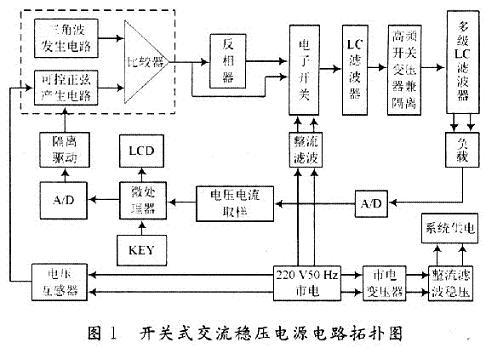 電壓和電流取樣電路從負(fù)載上獲取電壓和電流信號,分別送兩路A/D轉(zhuǎn)換器轉(zhuǎn)換,變成離散的數(shù)字信號。一方面用于通過微處理器處理后進(jìn)行實(shí)時(shí)顯示;另一方面用于通過微處理器處理后送D/A轉(zhuǎn)換器變換為模擬量,經(jīng)過光電隔離驅(qū)動(dòng)電路來控制正弦波發(fā)生器的幅值,又經(jīng)過比較器、反向器、高速電子開關(guān)、LC濾波、高頻開關(guān)變壓器、多級LC濾波等電路,用于控制負(fù)載上電壓或電流的穩(wěn)定。電壓互感器的作用是從市電中獲得低諧波失真的標(biāo)準(zhǔn)正弦波,經(jīng)由正弦波產(chǎn)生電路控制其幅值;鍵盤用于輸入準(zhǔn)備向負(fù)載提供的電壓或電流值。
