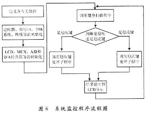 軟件部分的設(shè)計(jì)包括A/D轉(zhuǎn)換器、D/A轉(zhuǎn)換器、LCD顯示器、鍵盤系統(tǒng)等功能的子程序,還包含系統(tǒng)監(jiān)控程序和各種中斷服務(wù)程序等,其系統(tǒng)監(jiān)控程序流程圖如圖6所示。