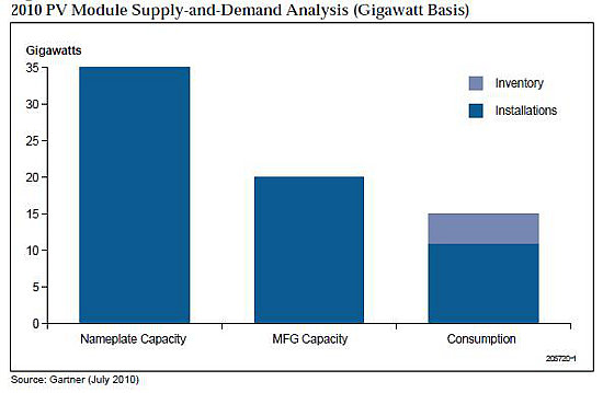 據(jù)市場調(diào)研公司Gartner表示,光伏組件制造商所聲稱的”售罄”情形及生產(chǎn)設(shè)備滿負(fù)荷運(yùn)轉(zhuǎn)的情形,與光伏組件實(shí)際的生產(chǎn)供應(yīng)情況極為不符。Gartner表示,光伏組件的實(shí)際生產(chǎn)供應(yīng)量約為20GW至24GW,而2010年預(yù)計(jì)新增安裝量僅為11GW多一點(diǎn)。由于兩個(gè)數(shù)據(jù)并不相互吻合,因此,Gartner擔(dān)憂市場將無法達(dá)到供需平衡。