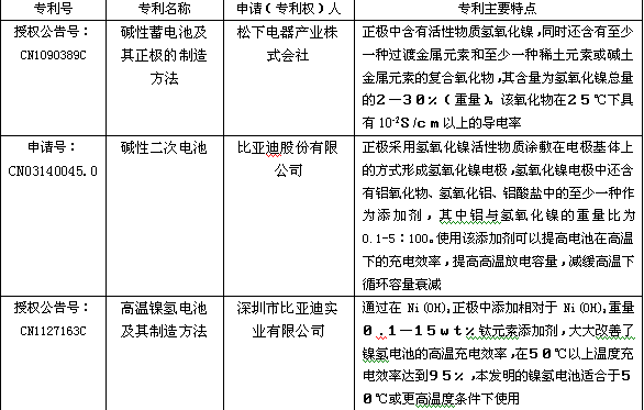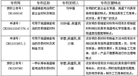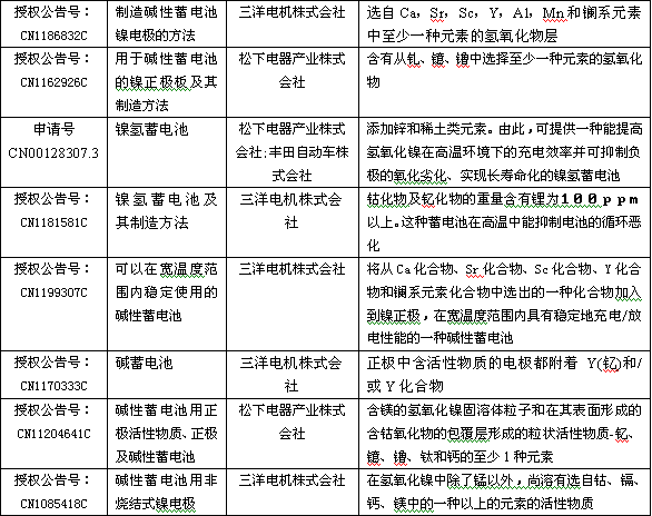 在電池配料時(shí),通過機(jī)械混合法添加周期表中ⅡA、ⅢB、ⅣB、ⅦB、ⅧB、ⅡB主族元素和3、4、5周期的元素、氧化物或氫氧化物,能較好地提高或改善鎳氫高溫性能。世界著名電池制造公司在華申請授權(quán)的專利中多有介紹,如日本松下、三洋;中國比亞迪;德國H.C.施塔克等公司。詳細(xì)見下表: