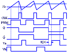 SG3525芯片各點(diǎn)的工作波形如圖3所示,由誤差放大器輸出的電壓Ve與鋸齒波的交點(diǎn)可得一負(fù)的PWM信號(hào)。由PWM信號(hào)、時(shí)鐘信號(hào)及分相器輸出的Q(或)信號(hào),根據(jù)或非門的邏輯可得兩個(gè)或非門的輸出信號(hào)Va和Vb。由波形圖可以看出,PWM比較器的反相輸入端電平越高,輸出脈沖Va和Vb的占空比越大;反之越小。根據(jù)這一規(guī)律來實(shí)現(xiàn)該控制器的調(diào)壓、軟啟動(dòng)及保護(hù)功能。另外,可以通過改變5腳和7腳之間的外接電阻的大小,使時(shí)鐘脈沖寬度變化來實(shí)現(xiàn)死區(qū)大小的調(diào)節(jié)。
