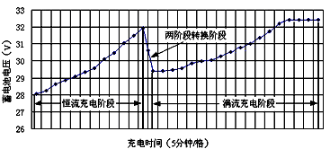 使用該蓄電池充電器對(duì)某型號(hào)航空蓄電池進(jìn)行了充電試驗(yàn),最大充電電流限制為30A,溫度限制值定為350C。蓄電池的初始電壓為20V,充電開始時(shí),充電器以20A的電流對(duì)蓄電池持續(xù)充電約58分鐘,然后以較小的電流3A對(duì)蓄電池進(jìn)行涓流充電,直至蓄電池電壓上升到32.45V時(shí),蓄電池兩端的電壓不再發(fā)生明顯的上升現(xiàn)象,此時(shí)充電器停止充電,歷時(shí)150分鐘,充電過程曲線示意圖如圖6所示。