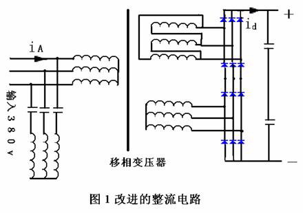采用如圖1所示的12脈波整流電路,移相30°構(gòu)成串聯(lián)2重結(jié)電路,利用變壓器二次繞組接法的不同,使兩組三相交流電源間相位錯(cuò)開30°,從而使整流輸出電壓在每個(gè)交流電源周期中脈動(dòng)12次,故為12脈波整流電路。變壓器二次繞組分別采用星形和三角形接法構(gòu)成相位角相差30°、大小相等的兩組電壓,接到相互連接的整流橋上。