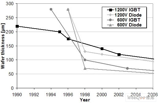 由于導通電壓和關斷損耗在很大程度上取決于晶圓的厚度,因此需要做更薄的IGBT。圖4顯示了英飛凌600/1,200VIGBT和EMCON二極管的晶圓厚度趨勢。對于新型1,200VRC-IGBT而言,120um厚度晶圓將是標準工藝。這需要進行復雜的晶圓處理,包括用于正面和背面的特殊處理設備。將晶圓變薄可通過晶圓打磨和濕式化學蝕刻工藝實現(xiàn)。