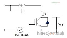 為了測量IGBT的集電極電流Ice,應在發(fā)射極和地之間使用超低阻值的取樣電阻器。圖11為Vce和Ic的波形(搪瓷燒鍋負載)。工作頻率為29.1kHz,LC電路在諧振范圍之外(電磁爐的溫度模式為50℃)。
