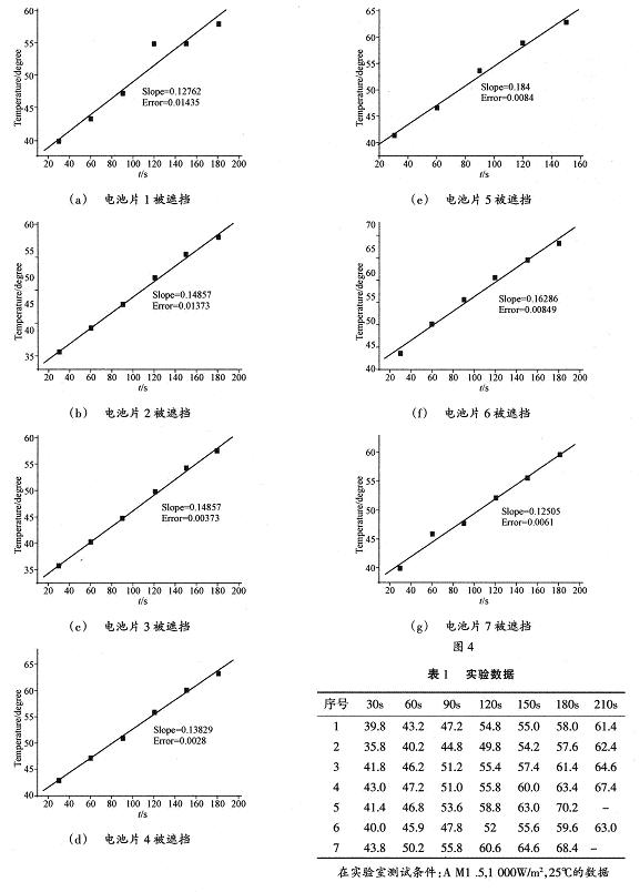 為了驗(yàn)證遮擋造成的溫度變化,我們在實(shí)驗(yàn)室進(jìn)行了測試來加以驗(yàn)證。如圖3(a)~圖3(g)所示,是在實(shí)驗(yàn)室模擬陽光照射,對一塊多晶硅太陽電池組件隨機(jī)挑選7塊硅片遮蓋所作的升溫實(shí)驗(yàn)曲線圖表,用Origin7.0軟件進(jìn)行的擬合: