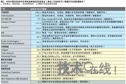 在奧巴馬政權(quán)的經(jīng)濟(jì)刺激政策“ARRA”的7872億美元中,美國(guó)能源部(DOE)將其中的14億9190萬(wàn)美元用于電動(dòng)車(chē)輛用充電電池的生產(chǎn)(表2)。利用該ARRA投資的條件是,接受投資的企業(yè)需要自行準(zhǔn)備與投資額大致相同的資金,因此共計(jì)有約30億美元的資金用于電池生產(chǎn)。