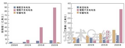 北美的大容量充電電池市場(chǎng)今后有望大幅增長(zhǎng)。據(jù)估算,2020年面向電動(dòng)汽車(chē)及電車(chē)等交通用途的市場(chǎng)規(guī)模將擴(kuò)大至99億美元左右(下圖)。