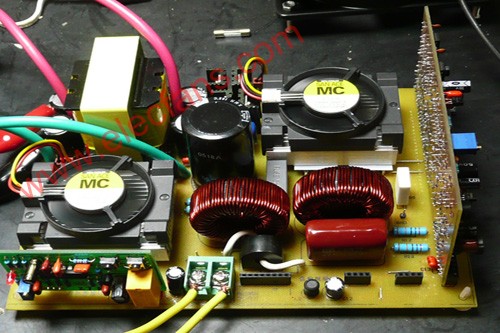 本機(jī)前級功率管和H橋的功率管都用風(fēng)扇散熱(安裝方法下面再詳述),這是一種小型儀表風(fēng)扇,比電腦上的CPU風(fēng)扇還要小一點(diǎn),實(shí)驗(yàn)證明,在600W輸出的情況下,H橋的4個功率管散熱不成問題,但前級的二個功率管好象散熱不夠一點(diǎn),如果有可能,最好用大一點(diǎn)的風(fēng)扇。