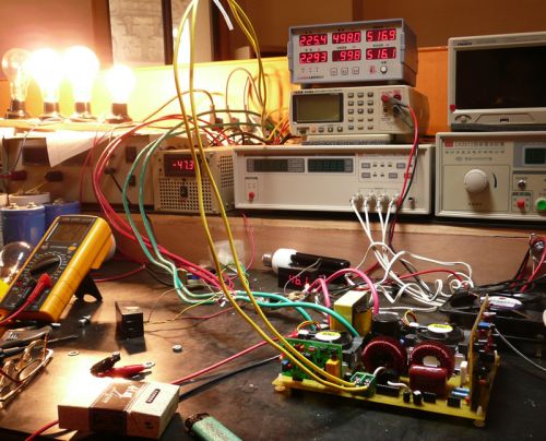 這里,可以稍稍為前級加點(diǎn)負(fù)載,可以用二個100W220V的燈泡串聯(lián)起來,接到高壓解的二端,這時電瓶電流可達(dá)到12A左右,讓它工作一段時間,看看前級功率管有沒有溫升,如果溫升不明顯,可以把電瓶保險(xiǎn)絲換大點(diǎn),繼續(xù)加大負(fù)載,一般在功率管散熱正常的情況下,前級可以加到600W左右。在加載的情況下,再看D極波形,應(yīng)該是正常的方波,稍有點(diǎn)尖峰是沒有關(guān)系的,如果尖峰過大,說明變壓器制作不過關(guān),要重新繞制。