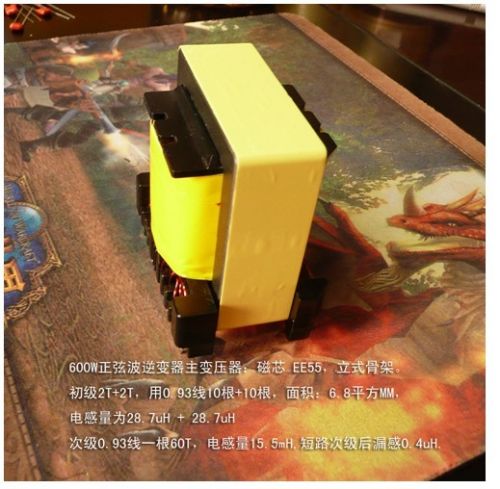 主變壓器是制作逆變器成功與否的關(guān)健,本機(jī)主變用的磁芯為EE55,材質(zhì)PC40,我在杭州電子市場買到了一種質(zhì)量很好的骨架,立式的,腳位11加11,腳粗1.2MM。繞制數(shù)據(jù):初級2T加2T,用10根0.93的線。初級導(dǎo)線總面積為6.8平方MM,次級為0.93線一根,繞60T。