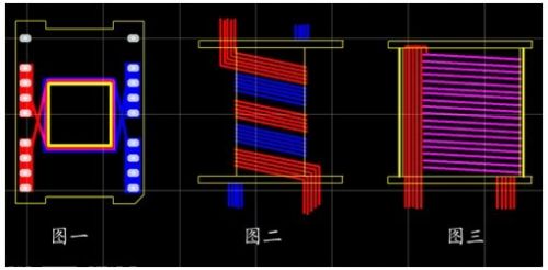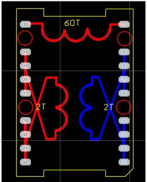 先用5根0.93線繞2圈(見圖二中紅線),中間留空隙,再在空隙處用另外5根線繞2圈(見圖二中藍(lán)線),每根線長約37CM。用同樣的方法繞二層,層間包二層膠帶,這樣就相當(dāng)于用了10根線并繞。繞完低壓繞組,在繞組外用高溫膠帶包三層。繞低壓繞組要注意的問題是:線頭留在下面,即骨架引腳處,線尾留長一點(diǎn),暫時留在骨架的上面(等繞完高壓繞組后要向下折下來)。從(圖一)可以看出,實(shí)際上,低壓繞組的頭和尾是有一段是重疊的,也就是不是2圈,而是約2.2圈,這樣做可以大大減少漏感。