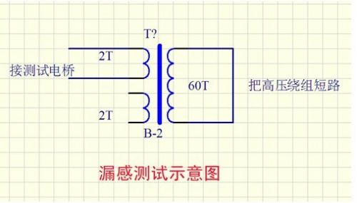 我發(fā)現(xiàn)用這種方法繞制的變壓器漏感比較小。以前用銅帶繞制,漏感一般在0.8uH以上,現(xiàn)在可以做到0.4uH以下。我想原因是:因?yàn)殂~帶要焊引出線頭,這樣就留下了一個錫堆,再繞高壓繞組時,中間就有一個空隙,導(dǎo)致耦合不緊。下圖為測試漏感示意圖。