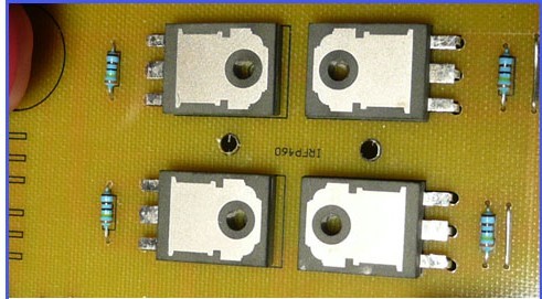 功率主板包括了DC-DC推挽升壓和H橋逆變兩大部分。該機(jī)的BT電壓為12V,滿功率時,前級工作電流可以達(dá)到55A以上,DC-DC升壓部分用了一對190N08,這種247封裝的牛管,只要散熱做到位,一對就可以輸出600W,也可以用IRFP2907Z,輸出能力差不多,價格也差不多。主變壓器用了EE55的磁芯,其實(shí),就600W而言,用EE42也足夠了,我是為了繞制方便,加上EE55是現(xiàn)存有的,就用了EE55。關(guān)于主變壓器的繞制,下面再詳細(xì)介紹。