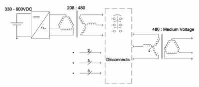 一個在設(shè)施入口處低壓一端擁有連接點的1兆瓦的商用屋頂系統(tǒng)需要1至4個并網(wǎng)光伏逆變器。采用傳統(tǒng)的逆變器時,每一個都必須與一個單獨的或定制的隔離變壓器相搭配——不論變壓器與逆變器是否集成,情況都是如此。因此,電力供應(yīng)立即被減弱了,因為隔離變壓器的效率通常只有98%到99%,它們最多可以讓效能下降2%。