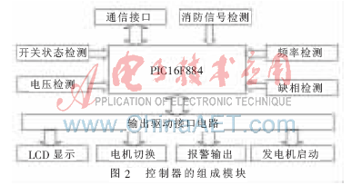 智能型雙電源開關(guān)控制器以單片機(jī)PIC16F884為核心,對(duì)兩路供電電源(常用電源和備用電源)的電壓、頻率和相位進(jìn)行實(shí)時(shí)檢測(cè)。當(dāng)其中一路電源(常用電源或備用電源)的電壓發(fā)生過壓、欠壓或是缺相時(shí),控制器就會(huì)發(fā)出電機(jī)切換命令,使供電電源自動(dòng)切換到另一路電源(備用電源或常用電源)上,以此來保障供電的連續(xù)性。控制器的工作方式主要有自動(dòng)方式和手動(dòng)方式兩種??刂破鞯慕Y(jié)構(gòu)框圖如圖1所示,組成模塊如圖2所示。