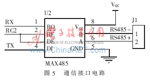 為了使控制器能夠方便地與上層控制平臺(tái)進(jìn)行聯(lián)網(wǎng)通信,實(shí)現(xiàn)控制器的遠(yuǎn)程控制、遠(yuǎn)程監(jiān)控等功能,本設(shè)計(jì)為控制器添加了通信接口,采用簡(jiǎn)單經(jīng)濟(jì)、廣泛應(yīng)用于工業(yè)上的RS485總線與外界進(jìn)行通信。RS485采用差分信號(hào)進(jìn)行傳輸,有較好的抗干擾能力,通過轉(zhuǎn)換模塊很容易實(shí)現(xiàn)從RS485到RS232的信號(hào)轉(zhuǎn)換,從而便于和上位計(jì)算機(jī)通信。選用了Maxim公司的MAX485芯片作為通信控制的主要器件,其工作電源為+5V,采用半雙工通信方式,能夠?qū)TL電平轉(zhuǎn)換為RS485電平,內(nèi)部包含了1個(gè)驅(qū)動(dòng)器和1個(gè)收發(fā)器,通過串口可以方便地與PIC16F884進(jìn)行通信。MAX485的接口電路如圖5所示。