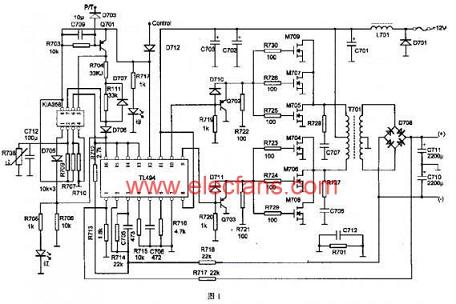 當C712充電完畢,2腳電平高于3腳電平,1腳翻轉為低電平,紅色發(fā)光二極管熄滅,保護撤消,工作正常,只有綠色發(fā)光二極管亮。TL494的14腳參考電壓由12腳提供,12腳經二極管D712連接汽車電源鎖,只有當汽車打開電源鎖后,12腳才有工作電壓,電源工作才正常。TL494的9腳和10腳輸出由Q703和Q702緩沖后推動場效應管工作,再由變壓器升壓,并經整流和濾波后以穩(wěn)定的正負電源形式向音響供電。作為開關管作用的Q702和Q703接法為無直流偏置。當TL494的9腳和10腳輸出驅動信號為高電平時,信號分別經二極管D711和D710加到FET柵極,這時Q703和Q702反偏截止。當驅動信號為低電平時,Q703和Q702導通,蓄積在FET柵極電容中的電荷快速放電,使FET關斷。