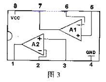安全保護電路由KIA358電路來完成。出現(xiàn)異常情況時向TL494的16腳提供高電平。KIA358為雙運放電路(如圖3)。