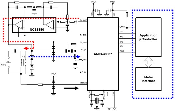 藍(lán)色箭頭表示接收路徑。變壓器從電力線耦合過來的信號(hào)經(jīng)AMIS-49587內(nèi)置放大器構(gòu)成的低通濾波器由內(nèi)部ARM進(jìn)行FSK解調(diào)分析。圖中黑色箭頭是50Hz的過零檢測(cè)信號(hào)引腳。系統(tǒng)依靠這個(gè)信號(hào)進(jìn)行同步定時(shí)。圖中藍(lán)色虛線內(nèi)是電表內(nèi)的應(yīng)用處理器,負(fù)責(zé)應(yīng)用層處理通信及計(jì)量?! ?br />