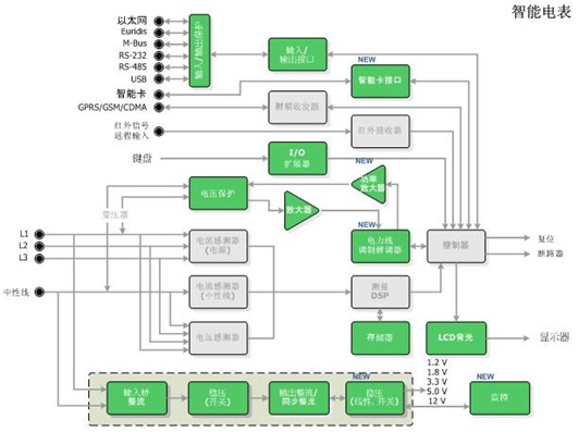 安森美半導(dǎo)體應(yīng)用于智能電表的完整解決方案安森美半導(dǎo)體應(yīng)用于智能電表的方案包含一系列標(biāo)準(zhǔn)產(chǎn)品、專用標(biāo)準(zhǔn)產(chǎn)品(ASSP)及專用集成電路(ASIC),可以提供智能電表的4種基本功能,包括:電源/電源管理、計(jì)量、寄存及通信,具體產(chǎn)品包括功率因數(shù)控制器、交流-直流(AC-DC)控制器、直流-直流(DC-DC)控制器、穩(wěn)壓器,MOSFET、整流器、三端雙向可控硅開關(guān)元件(TRIAC),PLC調(diào)制解調(diào)器、線路驅(qū)動(dòng)器及信號(hào)放大器,濾波、輸入/輸出(I/O)及數(shù)據(jù)保護(hù),LCD背光驅(qū)動(dòng)器,EEPROM存儲(chǔ)器,及智能卡接口等。圖2是由安森美半導(dǎo)體的多種器件(圖中綠色部分)構(gòu)成的智能電表應(yīng)用。