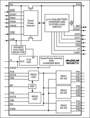 因為MAX8671X可以無縫管理USB和交流適配器電源,使得制造商能夠省去AC/DC墻上適配器充電零配件,從而降低了系統(tǒng)成本。其集成了眾多功能:電池充電器、適配器-USB-電池開關(guān)、系統(tǒng)電壓調(diào)節(jié)以及各種檢測功能(見圖1)。5路獨立的集成穩(wěn)壓器(3路2MHz開關(guān)降壓型調(diào)節(jié)器,效率高達96%;2路低靜態(tài)電流的線性穩(wěn)壓器)可以為多個子系統(tǒng)提供高效供電。