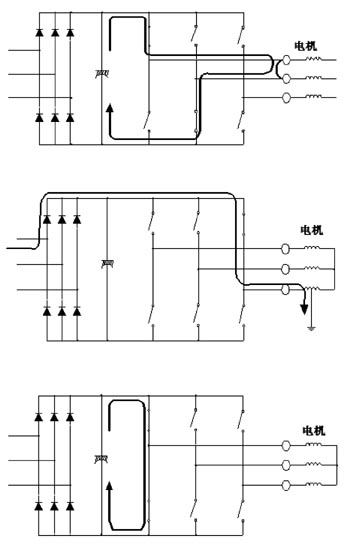 IGBT保護(hù)一般在硬件電路里實(shí)現(xiàn),根據(jù)要保護(hù)的過流條件的模式,具體電路和過流感測(cè)器件的類型會(huì)有所不同。其原因在于,在每個(gè)過流模式中的路徑和電流流動(dòng)是不一樣的。圖3a至3c顯示了每個(gè)過流條件模式的典型電流流動(dòng),在主要功率電路里的電流流動(dòng)及其路徑取決于過流的模式。在開關(guān)擊穿和線間短路條件下的短路電流總是流向直流總線上的電容器。然而,故障接地電流通常從交流線輸入,通過正直流總線和高側(cè)IGBT,流向故障發(fā)生的接地點(diǎn)。沒有電流流過總線電容器。