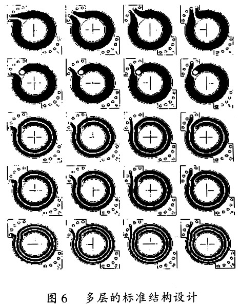 在雙面PCB板的每一層都是由一到多匝的繞組組成的,而且所有的層都保持著一樣的物理特性:即相同的形狀和相同的外部連接點(diǎn)。在有些多匝的層次中,這個外部連接點(diǎn)是不同匝數(shù)間的電氣連接點(diǎn)。如果有些層只有一匝,它也可以被印制在PCB的雙面來降低交流阻抗。使用銅箔直接印制在PCB板上來替代傳統(tǒng)的導(dǎo)線,即使在許多需要很多匝數(shù)的開關(guān)電源中,變壓器依舊能保持一個很小的體積,這便大大減小了整機(jī)的體積。具體的設(shè)計步奏和注意事項請參閱文獻(xiàn)[3]。圖6顯示了一個頂層的標(biāo)準(zhǔn)匝數(shù)設(shè)計的例子,它使用的是罐形(RM)磁芯。