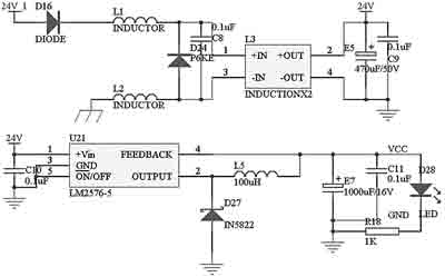 本控制模塊的電源電路如圖2所示。車載蓄電池—發(fā)電機的電源從24V_1處進入,二極管D16主要是防止電源的正負(fù)極被誤接反。電感L1、L2對電源進行濾波,和共模電感L3、電容C8配合,可以過濾掉電源中的尖峰脈沖。二極管D24P6KE51A是脈沖干擾抑制器(TVS),它可以快速吸收超過額定電壓的尖峰脈沖,瞬時通過電流很大,最大功率可達500~1000W。電容E5和C9進一步對電源進行濾波。過濾干凈的電流通過開關(guān)電源芯片LM2576變換為系統(tǒng)使用的5V電源。電容E7和C11對輸出5V電源進行濾波,電阻R18和發(fā)光二極管D28指示當(dāng)前是否有電。