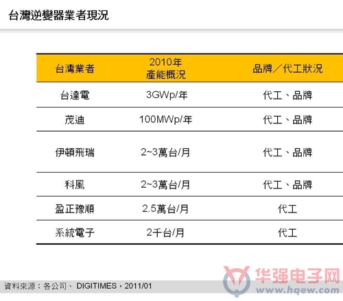 DIGITIMES Research預(yù)估,大陸業(yè)者受惠于大陸內(nèi)需市場,2011年出貨量將持續(xù)攀升,目前大陸的逆變器品質(zhì)與國際逆變器相比雖有落差,但長遠(yuǎn)來說,大陸業(yè)者可通過在當(dāng)?shù)厥袌龅膽?yīng)用,不斷調(diào)整改進(jìn)產(chǎn)品性能,將產(chǎn)品提升到一定程度后再打入國際市場。