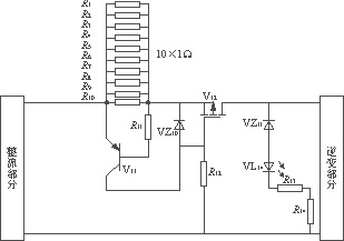 在圖8中,R1—R10為1Ω的標(biāo)準(zhǔn)電阻,功率為2W,當(dāng)電流超過預(yù)定值時(shí),在并聯(lián)電阻上的壓降超過0.7V,三極管導(dǎo)通,此時(shí),MOSFET將因柵源極間承受反向電壓而截止,從而切斷主電路;當(dāng)電流值正常時(shí),MOSFET正常導(dǎo)通,不會(huì)影響電路的正常工作。這種電路的缺點(diǎn)在于,如果電路中出現(xiàn)時(shí)斷時(shí)續(xù)的過電流時(shí),MOSFET將會(huì)不斷地動(dòng)作。為此,在圖3中還加入了其他保護(hù)元器件。